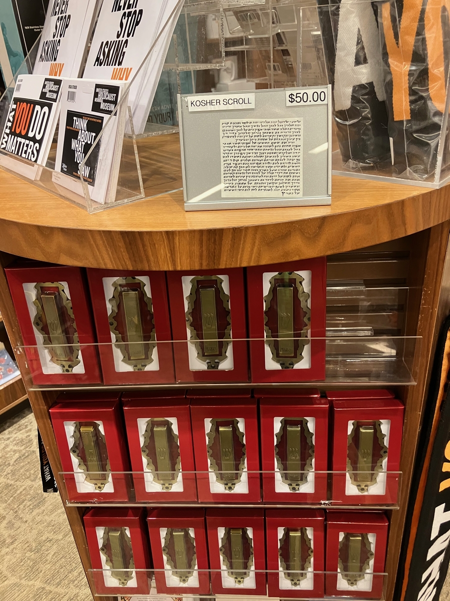 United States Holocaust Memorial Museum store shelf with replicas of the "Meed" mezuzah for sale. Above the replicas the store offers a “kosher scroll” (klaf) for insertion into the mezuzah. Photograph Oren Stier.